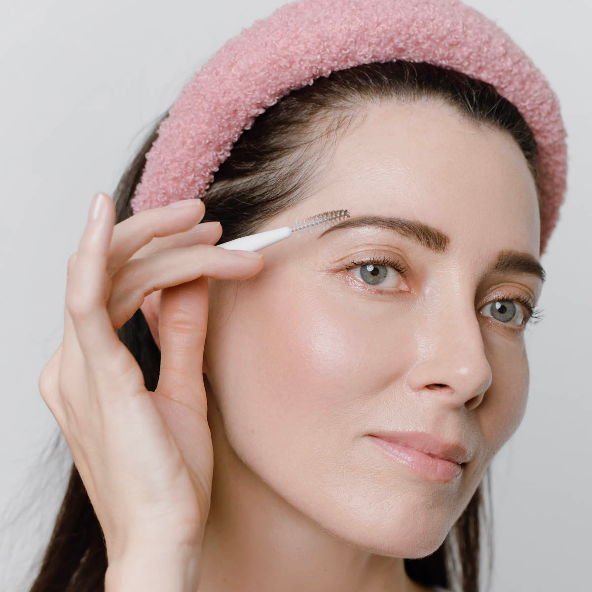 Start by putting on our beautiful berry "brow band" to keep hair out of your face during brow product application. Next, apply The Brow Trio (stencil and pomade kit) to create your dream brows. Use the brow extras grooming kit to groom your brows and make any touch-ups. A brush is included in the extras kit and can be used to blend pomade. Next, use the brow gel to set your brows in shape. Use the signature sponge brush cleanser every week to remove pomade and bacteria.